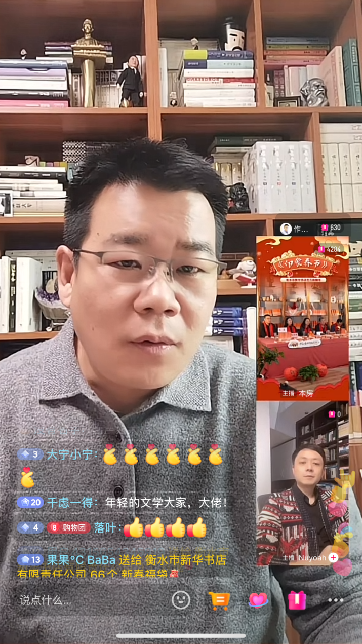 春節(jié)是中華民族最隆重的傳統(tǒng)佳節(jié),也是中華民族文化自信的展現(xiàn)。1月25日下午,《印象春節(jié):文學(xué)大家談中國傳統(tǒng)節(jié)日》研討會(huì)在衡水新華書店抖音直播間及衡水書城融合線上線下兩種方式同步開講。